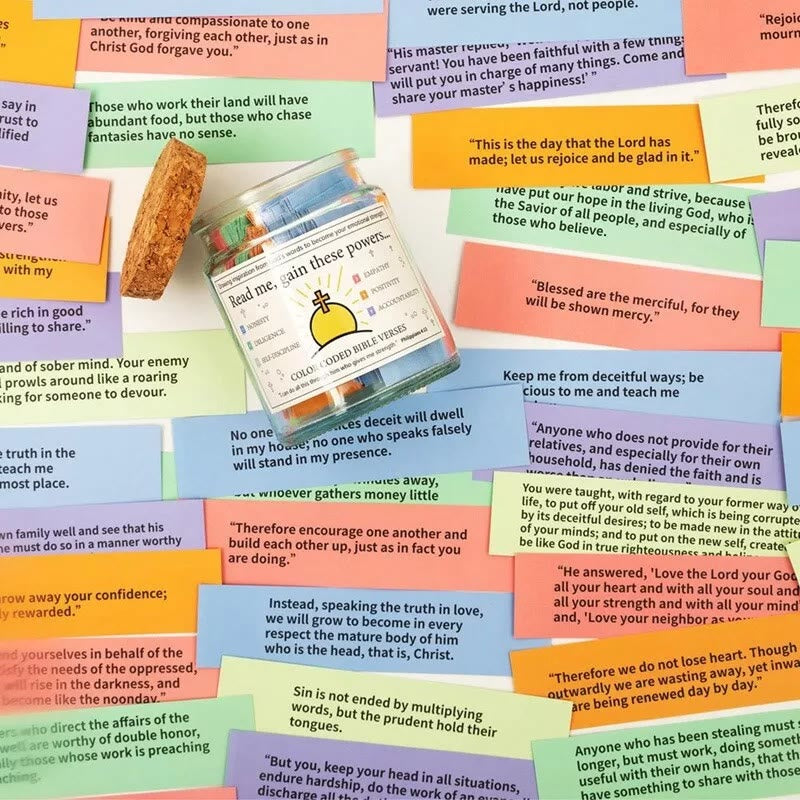 Our "Read Me When..." Bible Verse Jar is filled with color-coded scriptures for every mood. Whether you're feeling thankful, anxious, or lonely, each verse offers comfort, guidance, and hope.
